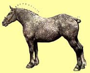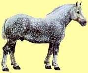 The Percheron has an aptitude for farm and draft work and a very quiet and docile, but energetic temperament. Known for their particularly friendly disposition, the Percheron is strong with good endurance. this handsome, clean-legged and free-moving heavy horse is one of the most elegant of the heavy draft horse breeds. Together with the Boulonnais, which is another elegant heavy horse, it owes a lot to the Oriental influence. It is said to be "an Arabian influenced by climate and the agricultural work for which is has been used for centuries." This statement, made by a 19th Century authority, reflects the strength of the eastern influence even though the authority may have had an excess of enthusiasm for the breed.