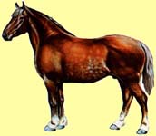 The particular build of this breed is implied in the epithet "Punch," and has been described as "barrel-shaped with not much daylight under." The English dictionary defines Punch as a variety of English horse, short-legged and barrel-bodied, "a short, fat fellow," a description which fits its subject exactly. The Suffolk has clean feet and no feathering. It is always "chesnut" in color, the spelling traditional in Britain when applied to this breed, and it is always spelled that way in the breed records. Its even color comes in seven shades - brown-black, dull-dark, light-mealy, red, golden, lemon and bright "chesnut."