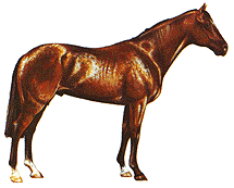 Originating from cool temperate environment of Great Britain (England), the hot-blooded Thoroughbred is distributed worldwide. Dating to the 17th and 18th centuries, it is a dolichomorphic-type horse of elegant lines and harmonious form. The fastest and most valuable of the world's equines, the Thoroughbred is bred for an enormous industry with its sole purpose that of producing racing animals. Thoroughbreds are essential to the bloodlines of the world's competition horses, and are used to improved and refine many warmbloods. The Thoroughbred is comparatively long alongisde the more heavily built breeds of Europe, and with its near-perfect proportions, this highly courageous horse is of great quality and posesses excellent athletic abilities, as well as both physical and mental stamina. The one drawback the Thoroughbred possesses as a common horse for everday folks is its high-strung and often difficult to handle temperament.