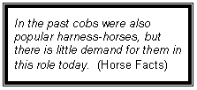 The Cob is a 'stuffy,' short-legged type of horse, standing up to 15.2 hands high, with a small head set on an elegantly arched neck, a short, deep body and ample quarters. He should give a comfortable ride and have an infinitely placid, obedient temperament. A good Cob makes a wonderful ride for elderly or nervous riders and, as a hunter, what he lacks in speed he will make up for in handiness and good manners. There is not basic breeding pattern for producing a good cob, and many of the best are the result of chance crosses. As with the Hack and the Hunter, many of the best Cobs may be seen in the show ring. The Cob always used to be shown with docked tail and hogged mane, a fashion which emphasized his stocky appearance. The Docking and Nicking Act, passed in Britain in 1948, made the practice of docking horses' tails illegal. It is, however, still usual to hog a Cob's mane. (Enc. Horse 1983)