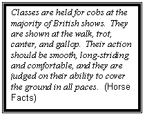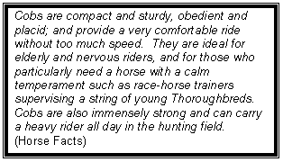 The Cob should display low action from the shoulder and should be able to gallop well. These sturdy, compact horses are sometimes referred to as 'heavyweight hunters on short legs’ (Ultimate Horse). Typically billed as the ideal mount for a more elderly, less athletic ride, the Cob should not give the impression of a dull slug. Cobs DO have a calm, steady ride and impeccable manners. They should also be active and willing, so that they may provide a rider with a safe and enjoyable day’s hunting. While they may not compete at the highest level due to their stocky builds, Cobs should be able to participate in a variety of competitive events. The Cob possesses considerable jumping ability, with a common sense which usually ensures safety and willingness in accomplishing tasks t it is asked to perform.