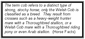 Originating in Britain, the Cob is a "type" rather than a breed. While Cobs may be found around the world, they are predominately found throughout Great Britain. The average height for a cob is between 14.2 and 15.2 hands high (58-62", 147-157cm). Some may be as tall as 16 hands and they can be any color. It is compact and muscular and suitable for hunting, showing and general riding. The term "cob" came into use in the 18th century. Prior to that, horses of this type were referred to as "rouncies," which is derived from feudal times -- Squires rode them into battle and estate stewards rode them during times of peace. Cobs are generally produced by chance and are often the by-product of Hunter breeding. Welsh Cobs are an exception to this type class and are classed as a breed. Often Welsh Cobs are used in the production of cob-type riding horses.